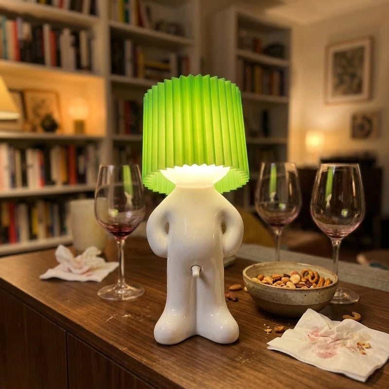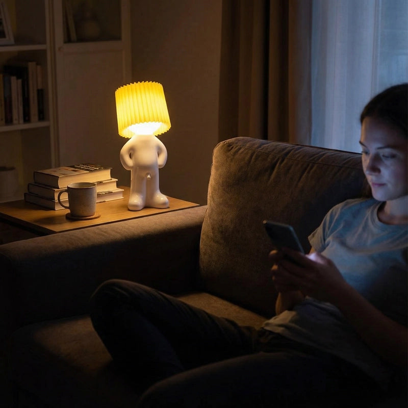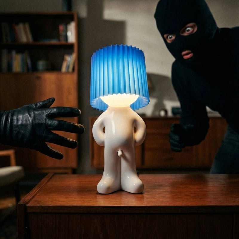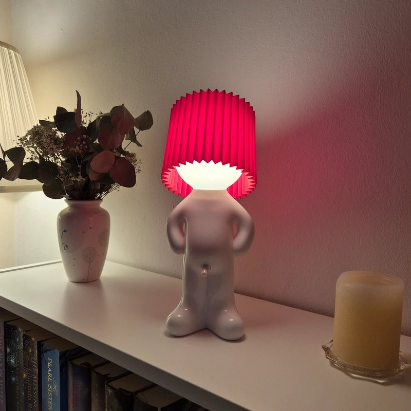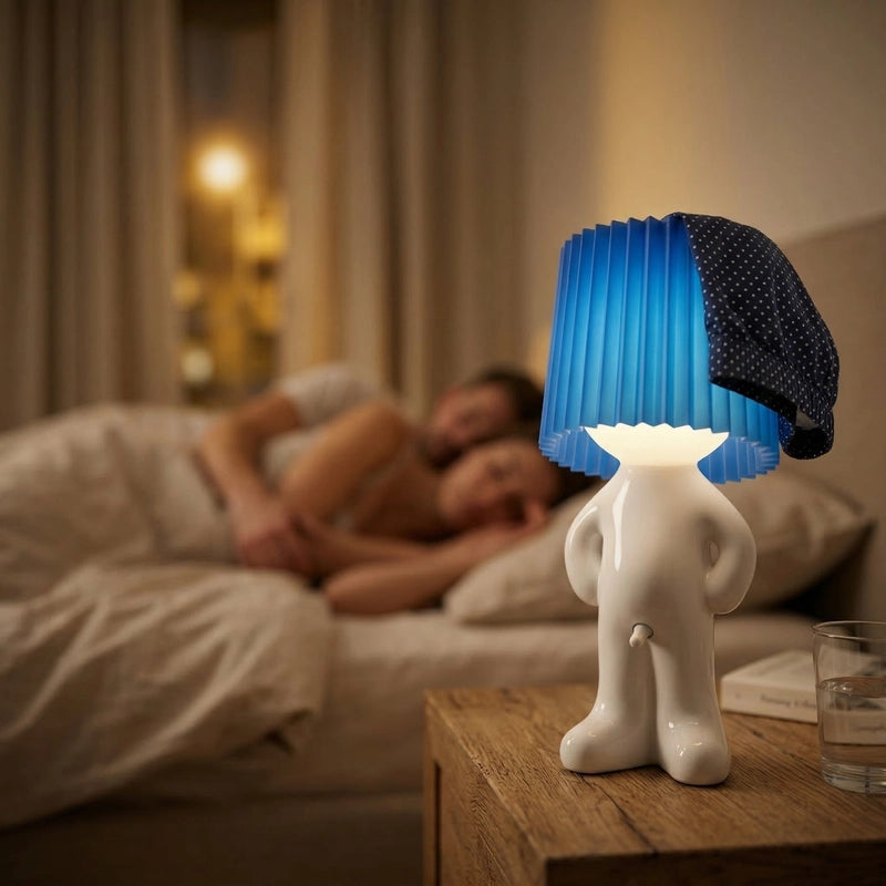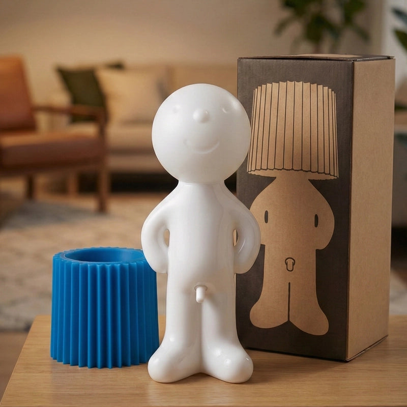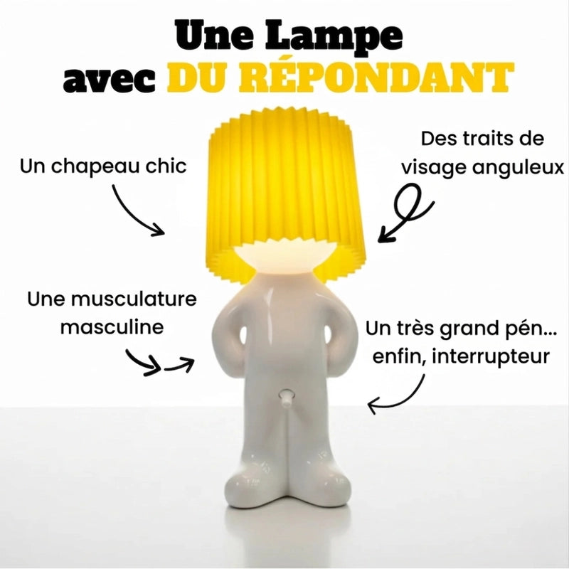 Imagine. C'est mardi. Le réveil n'a pas sonné. Ton café est froid, t'as un mail de ton boss qui commence par "Suite à notre échange..." et ton chat a vomi sur le tapis. La journée est foutue avant même d'avoir commencé. Et là, en passant devant ta table de chevet, tu croises Arthur. Nu comme un ver. Imperturbable. Son abat-jour légèrement de travers. Un sourire en coin. Ce genre de journée ne change pas. Mais Arthur, lui, te rappelle qu'on peut au moins en sourire.