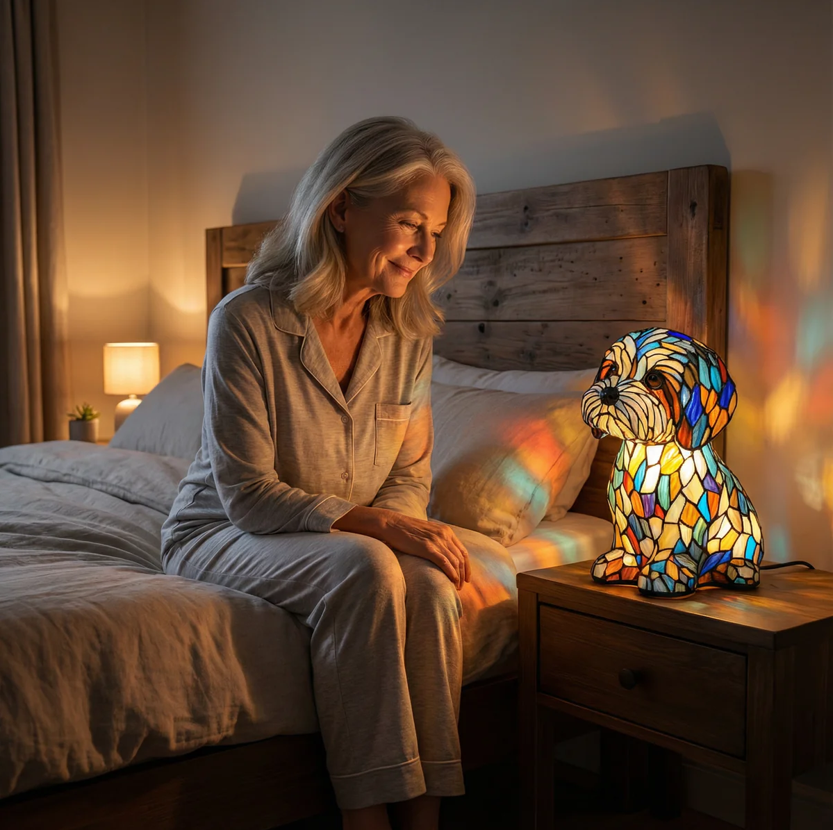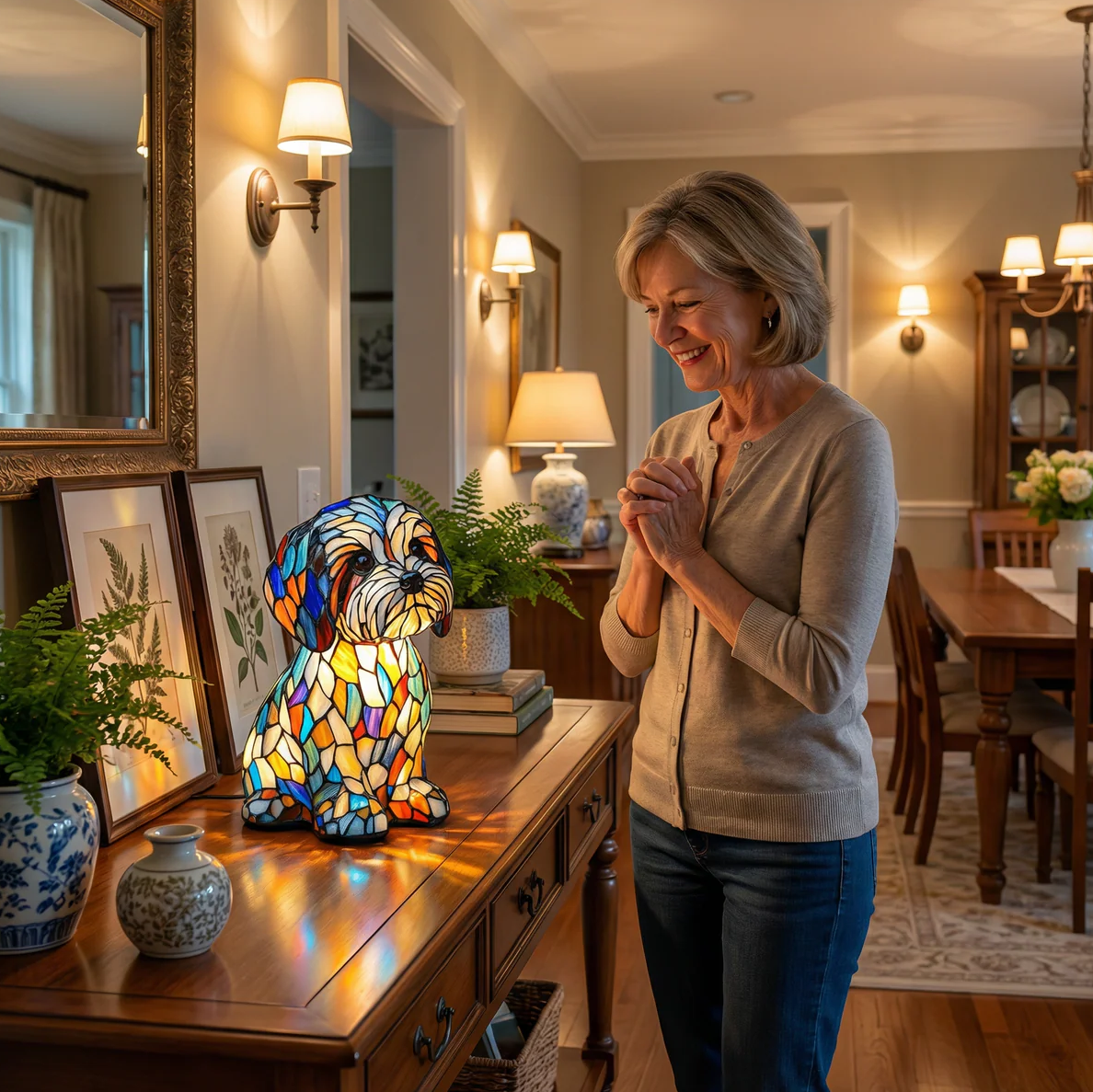 « Il y a quelque chose de vraiment spécial dans cette lampe. Elle dégage une sensation intemporelle, chaleureuse et pleine de caractère. Le verre coloré reflète magnifiquement la lumière la nuit et donne vie à ma pièce. C’est le genre d’objet dont on tombe amoureux instantanément. »